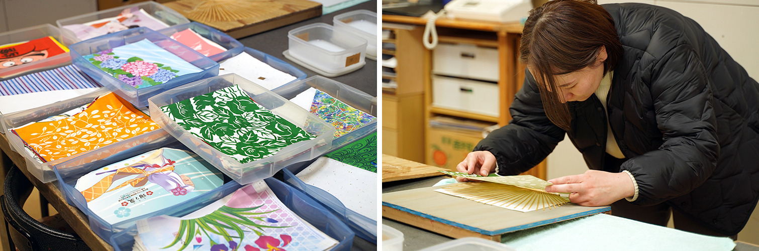 貼りの工程では、たくさんある図柄から好きな紙を1枚選び、先に作った骨に破れないように、丁寧に優しく貼り付けます。