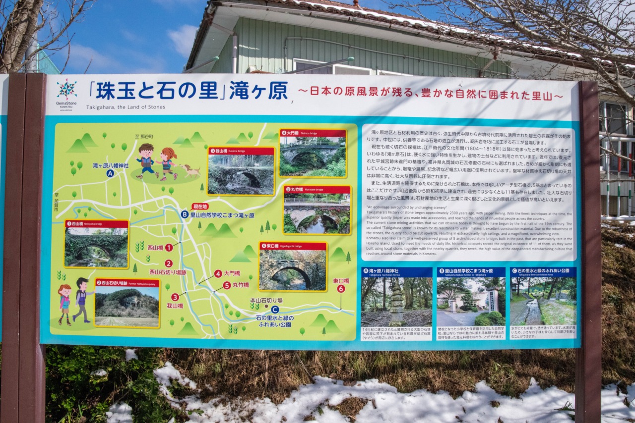 加賀市のお隣・小松市にある、豊かな農村風景が広がる滝ヶ原集落。凝灰岩の産地として栄え、そこから切り出される石は福井県丸岡城の屋根瓦にも利用され、近畿地方や北海道などにも運ばれていました。石切場や明治後期につくられたアーチ型の石橋が今も残る滝ヶ原の散策ツアーに参加してきました。