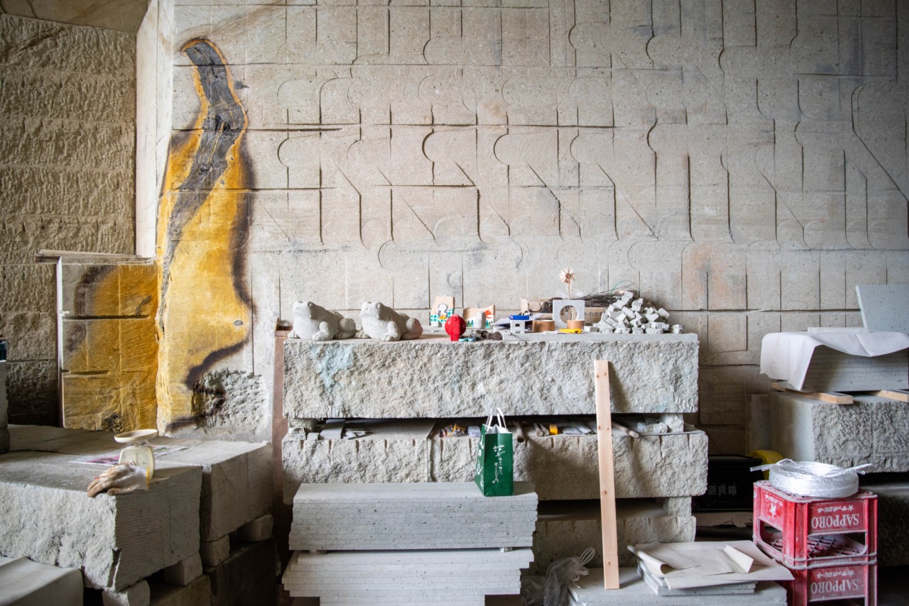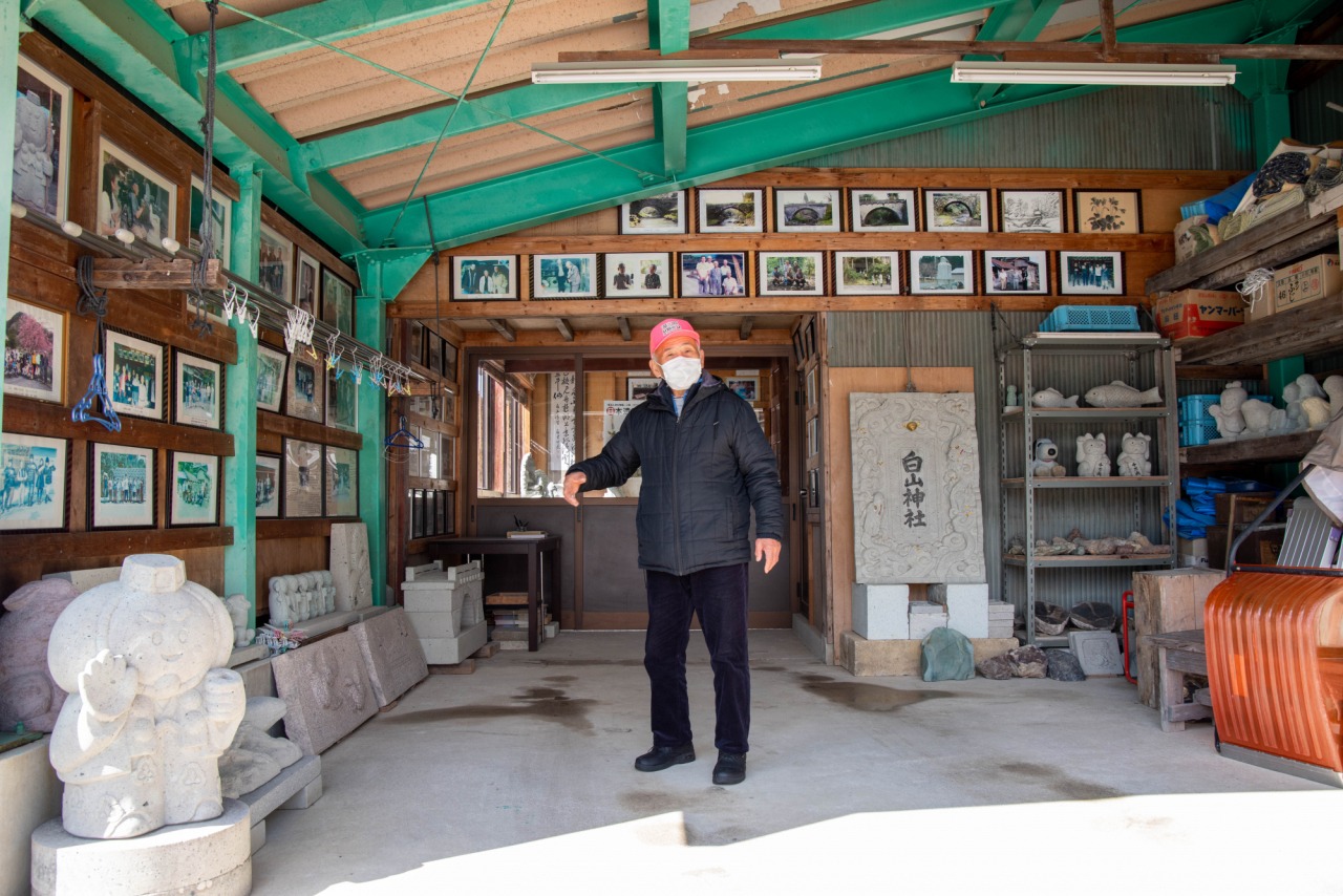 案内されたのは、石材彫刻師の中谷さんの工房。石製品の再興権威「石匠位(せきしょうい)」にも認定されている石工の達人です。石で出来ているとは思えないほど繊細な作品の数々を見ることができ、中でも不動明王が孔雀の上に鎮座する作品は圧巻でした。