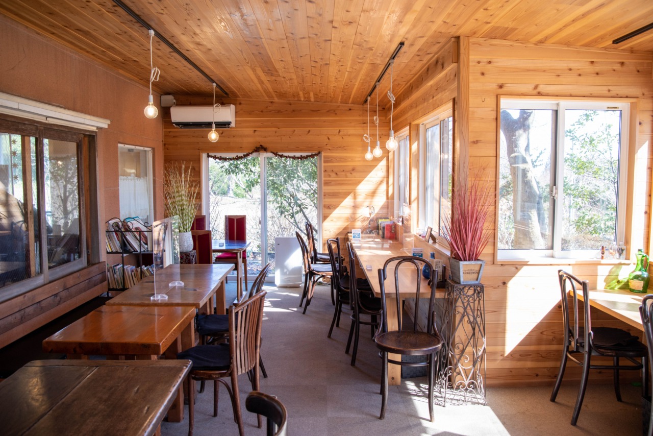 まるで森の中に建っているかのような心地よい雰囲気の店内。屋外には大人数で食事できるテラスがあり、天気の良い暖かい日には外で楽しめます。食事メニューもあるので、家族や友達とのお出かけにもオススメのお店です。