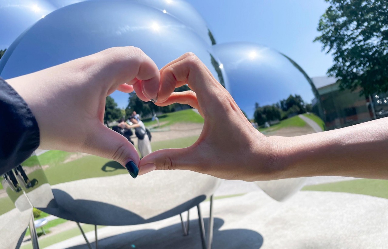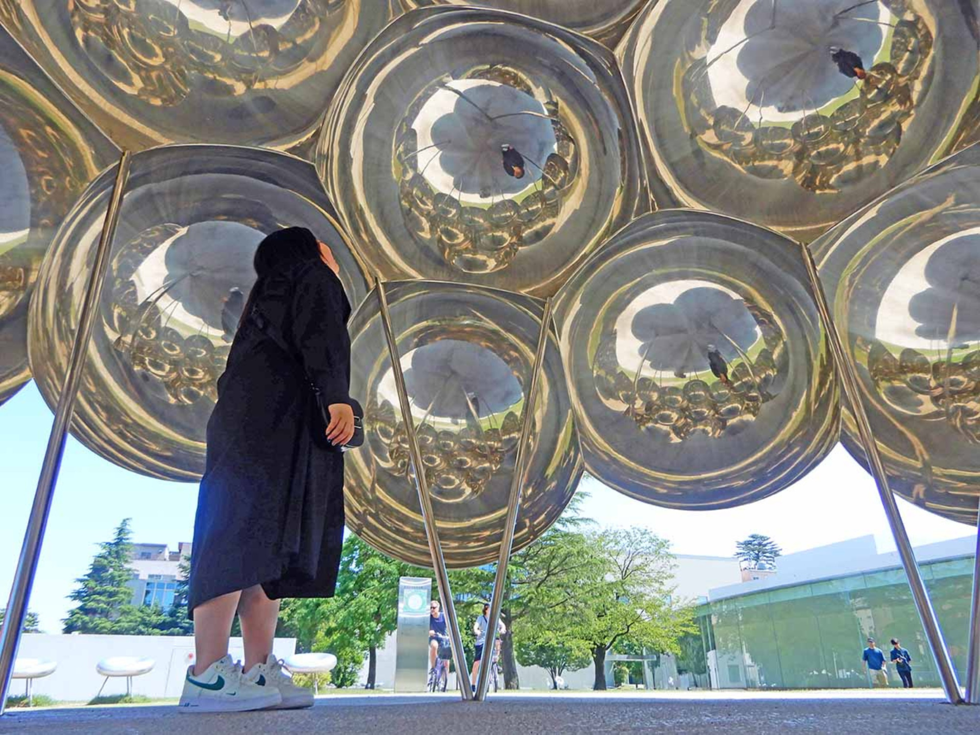 2014年の開館10周年を記念して、金沢21世紀美術館を設計した日本の建築家ユニット《SANAA》によって作り上げられた作品です。鏡のような半球がいくつも集まって、ひとつの「まる」になるような形。背景に美術館が映るに撮るのがオススメ◎