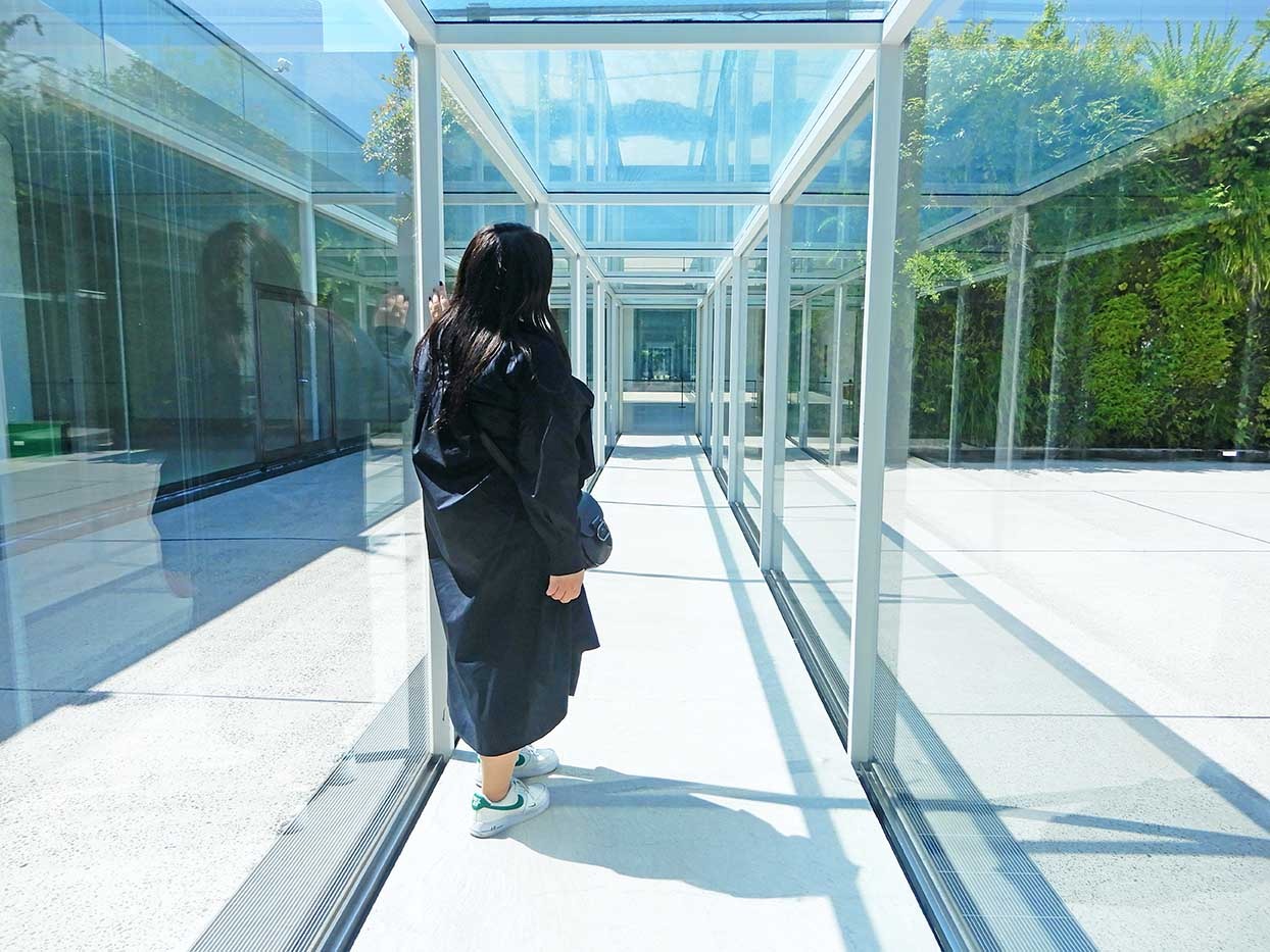 透明な通路の先には、壁一面の緑!!!なんと植物が壁面に植え付けられているのです!!!