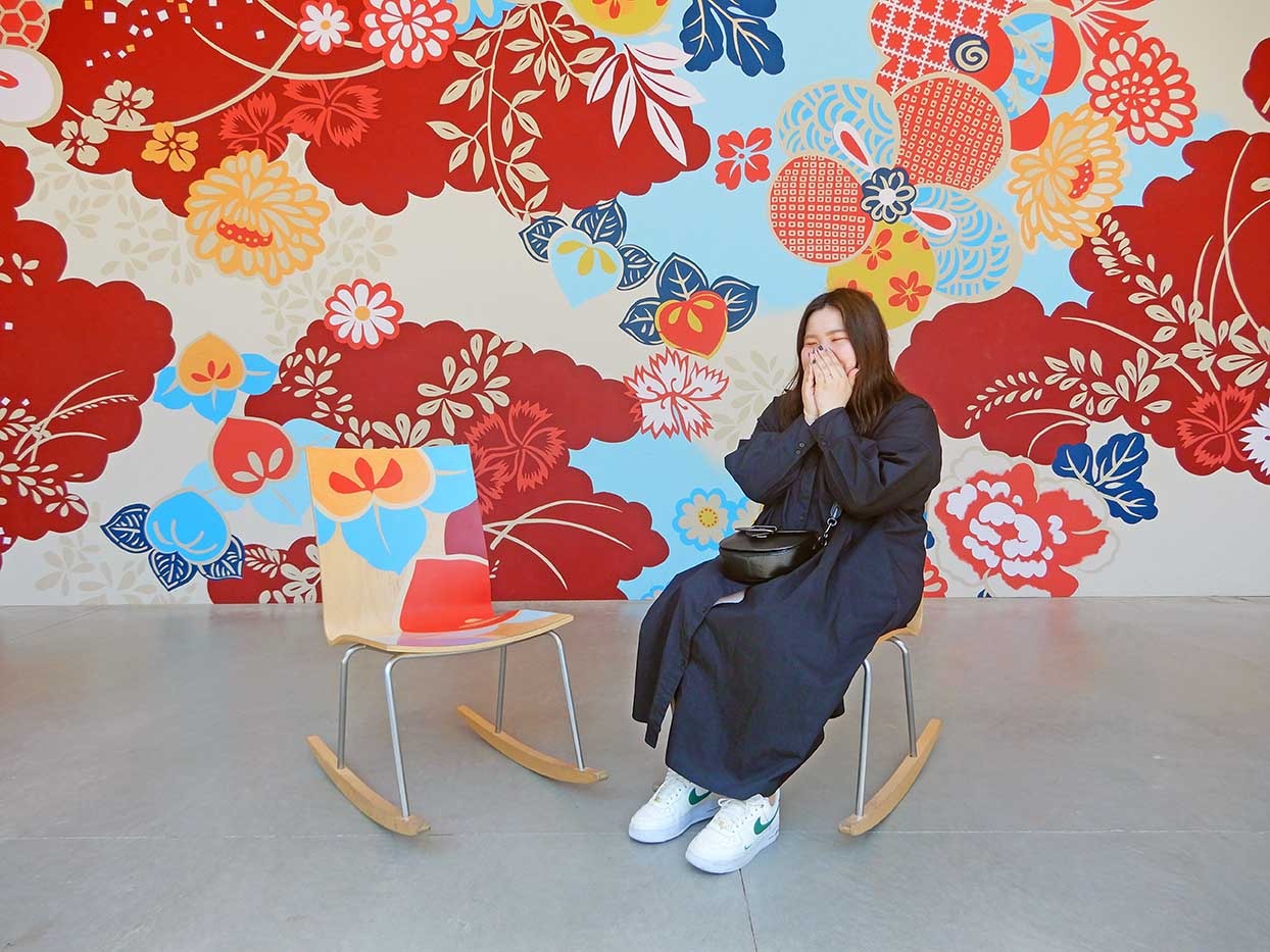 加賀友禅の古典図案から構想された花模様、それが壁いっぱいに広がるこの空間・・・実は休憩コーナーなのです!壁の前に置かれたロッキングチェアは、これまた《SANAA》とのコラボレーション。ひとつひとつ柄の出かたが違うので、ぜひお気に入りの椅子を探してみて下さい^^