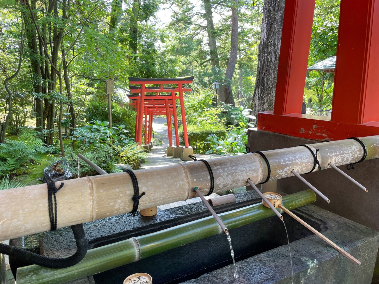 表参道は一の鳥居をくぐった瞬間から、結界の中に入ったような身が引き締まる雰囲気です。この日の気温は最高34度。その暑さを忘れるくらい、流れる滝の水音や、木々のそよぎが心地よく、二の鳥居、三の鳥居へと向かいながら心身共に清められている・・・そんな不思議な感覚がしました。
