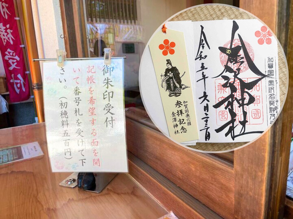 金澤神社の御朱印は社務所で直書きしていただけます。初穂料は500円。文字の部分に添えられている金箔は、金城霊澤・芋堀藤五郎の物語になぞらえているそうです。梅の紋と天神様が描かれた栞も添えられていました。