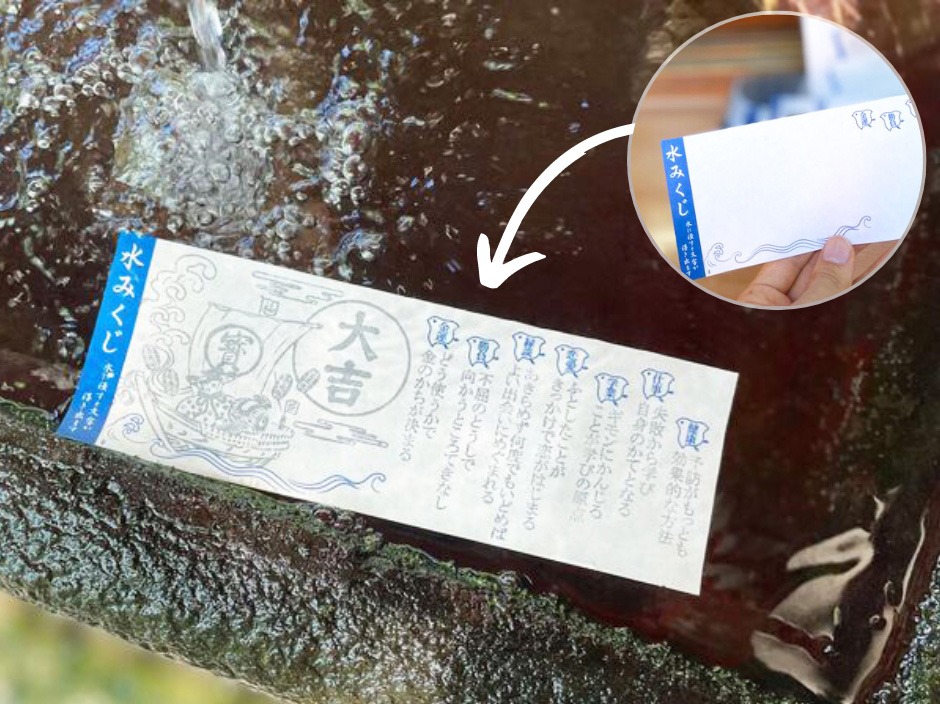 水ととても関りの深い神社のためか、水みくじがありました。初穂料の100円を納めて金城霊澤の霊水が汲みあがる手水舎へ。じんわりと絵や文字が浮かび上がるのかと思いきや、水に浸した瞬間「大吉」の文字が!これには後ろに並んでいたマダムも一緒にビックリ!(笑)