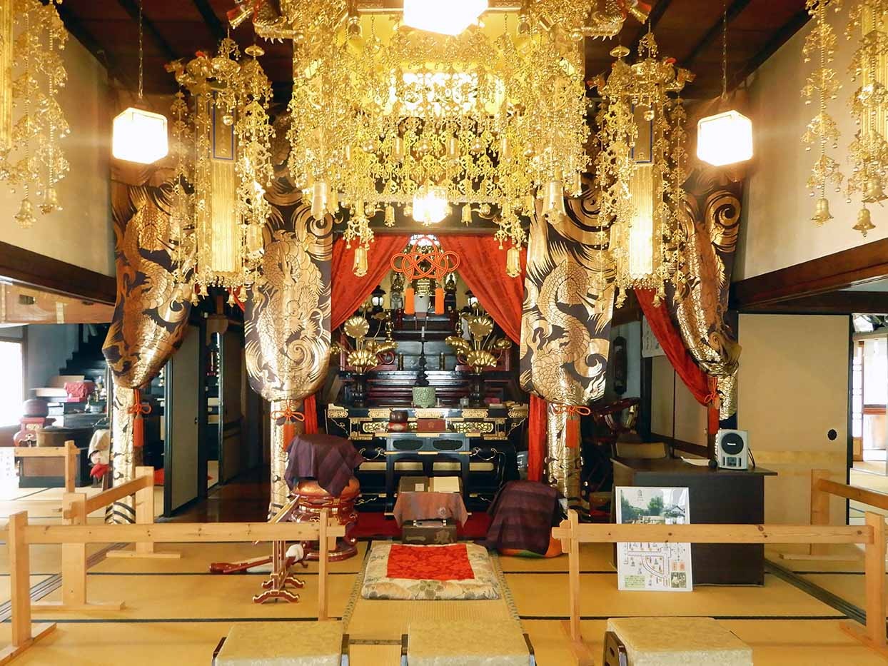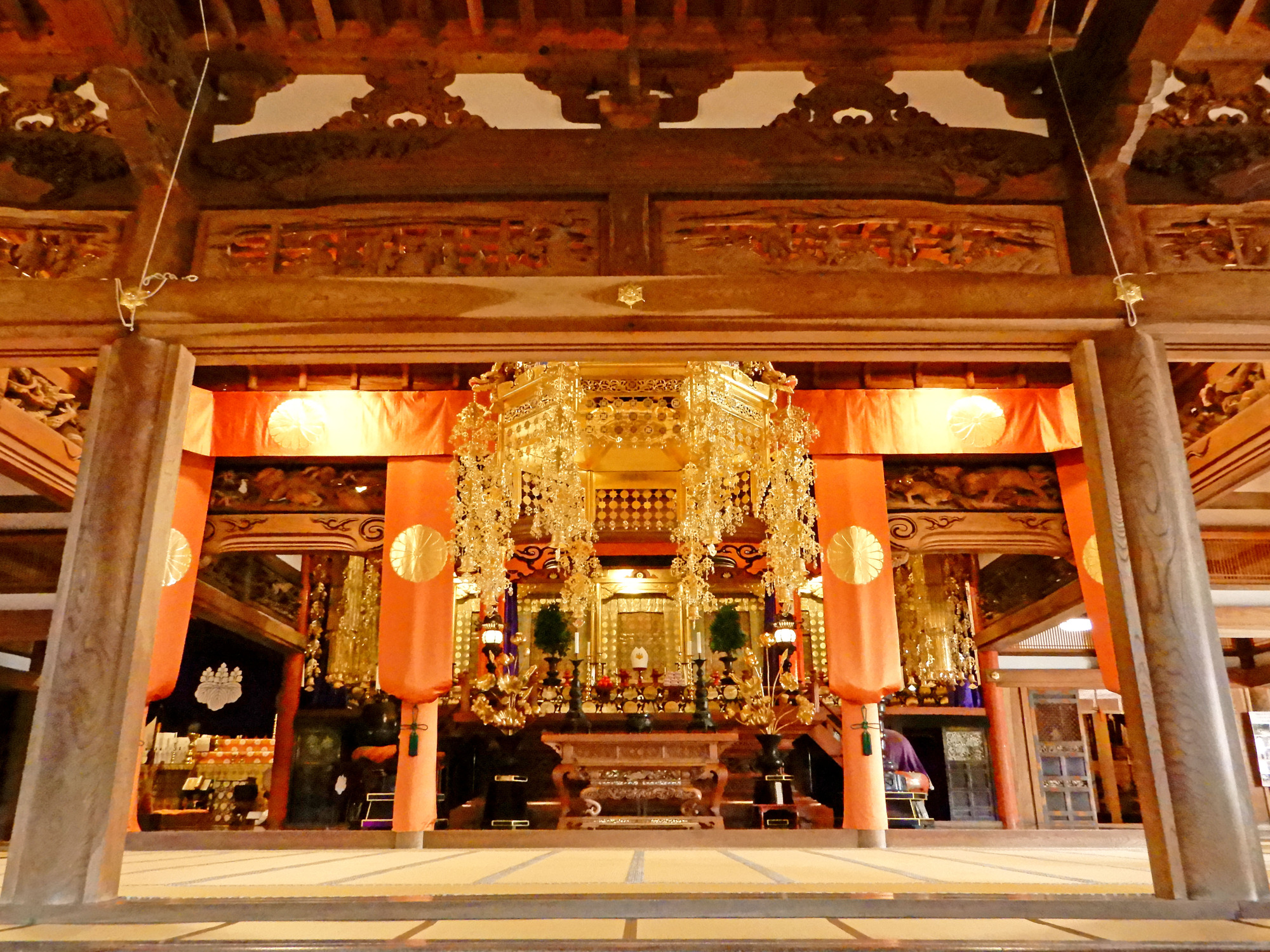 平成26年に修復工事も完了し、内部も拝観できるようになりました。中に入ってみると、大きな天蓋が金ピカで眩しい…! 正面には開祖の瑩山禅師、その両脇に道元禅師(どうげんぜんじ)と二祖・峨山禅師(がさんじょうせきぜんじ)が祀られています。