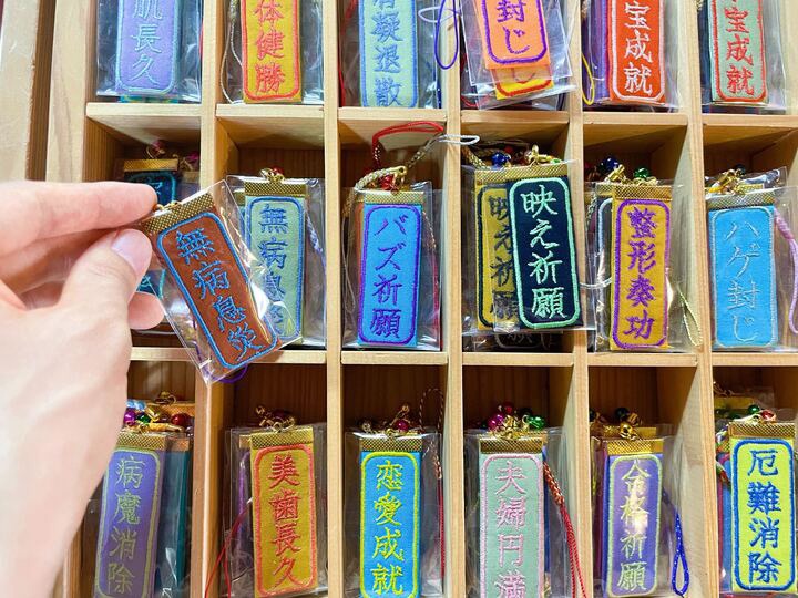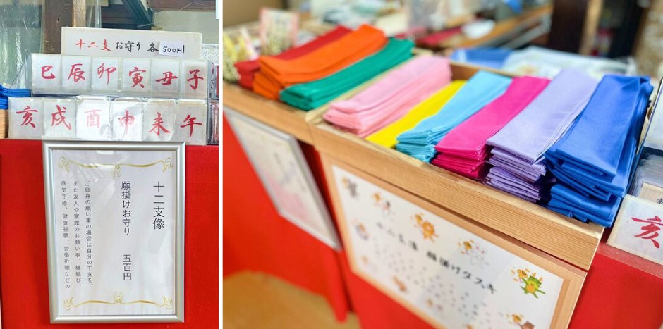 また、幸福の道の十二支像に掛ける「願掛けタスキ」も人気です。タスキには本堂で願い事を書いて幸福の道に進みます。好きな色を選べるので、若い方は所謂「推しカラー」を選ばれることも多いんだとか。