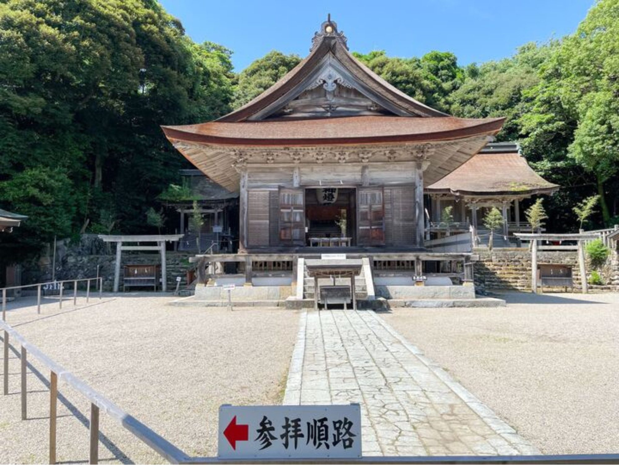 手水舎でお清めを済ませたら、いざ本殿へ。大きな檜皮葺の屋根が印象的な神門は桃山時代のものだそう。神門をくぐると「参拝順路」の看板が。順路に沿って左に進むと、まず初めにお参りするのが「事代主神(ことしろぬしのかみ)」をお祀りする若宮神社。事代主神は七福神の「恵比寿様」としても有名ですよね。「商売繁盛」「五穀豊穣」などのご利益があります。