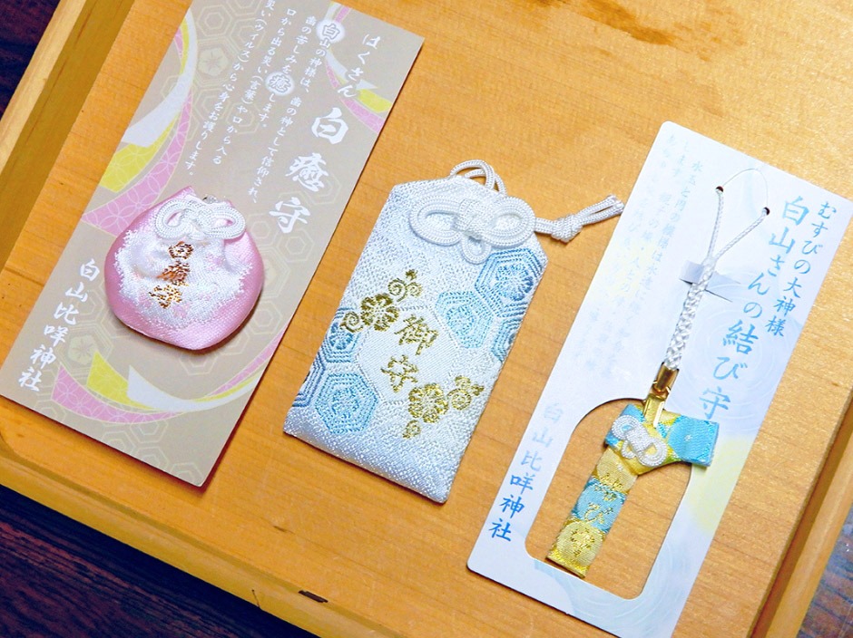 人気のお守りは「結び守」。「菊理媛尊」の“結びの力”と、白山信仰の象徴である“命の水”のイメージを連想させるデザインが印象的です。また、白山は歯苦散(はくさん)の語呂合わせで、歯の苦しみを癒すとされます。そのため、口から出る災い(言葉)や、口から入る災い(虫歯、ウイルス)から心身を守る「白癒守(はくいまもり)」も人気です。