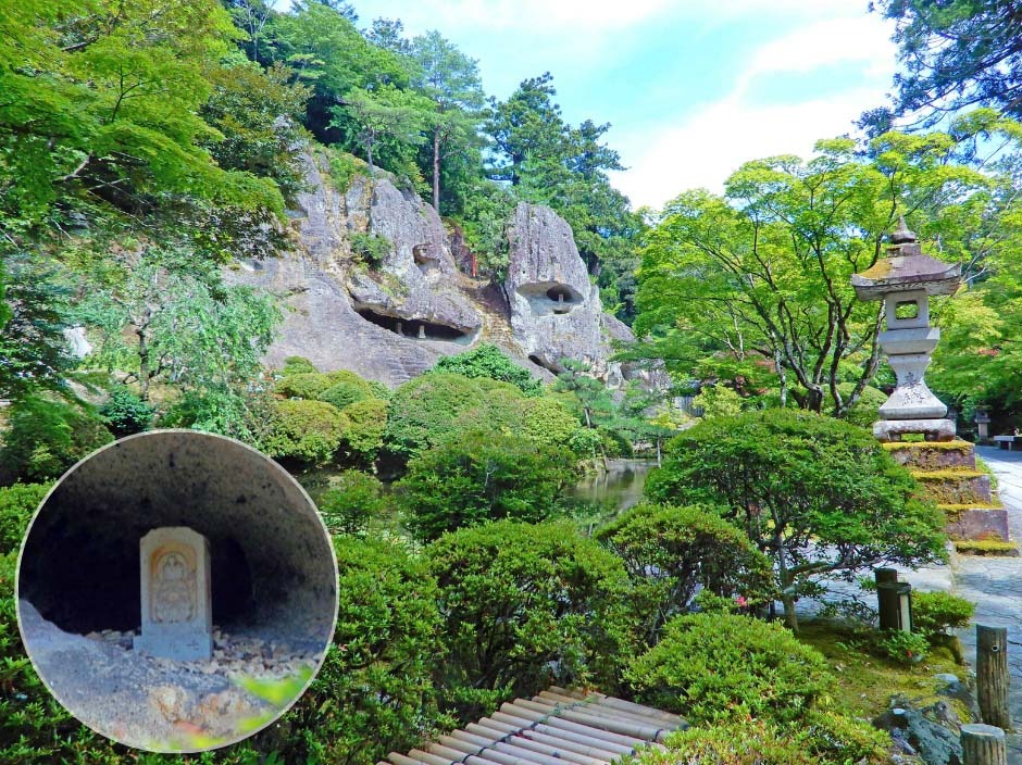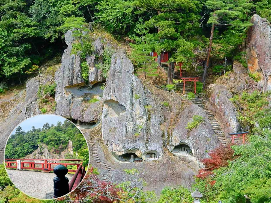 “おくの細道の風景地”として国指定名勝となっている「奇岩遊仙境」は、不思議な形をした岩の開口部に多くの石仏が安置されています。この奇妙な岩の形状は海底噴火の跡と伝えられており、永い年月をかけて風と波に浸食され現在の姿になったそうです。