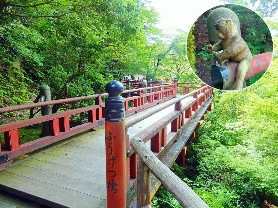 さらに歩き進めると曲がりくねった美しい橋「楓月橋」が見えてきます。橋の中腹には可愛いお猿さんもいるのでお見逃しなく。この子は庚申さん(青面金剛)のお使いとされていて、「猿(エン)」=「縁(エン)」の響きから縁結びのご利益をいただけるみたいです。