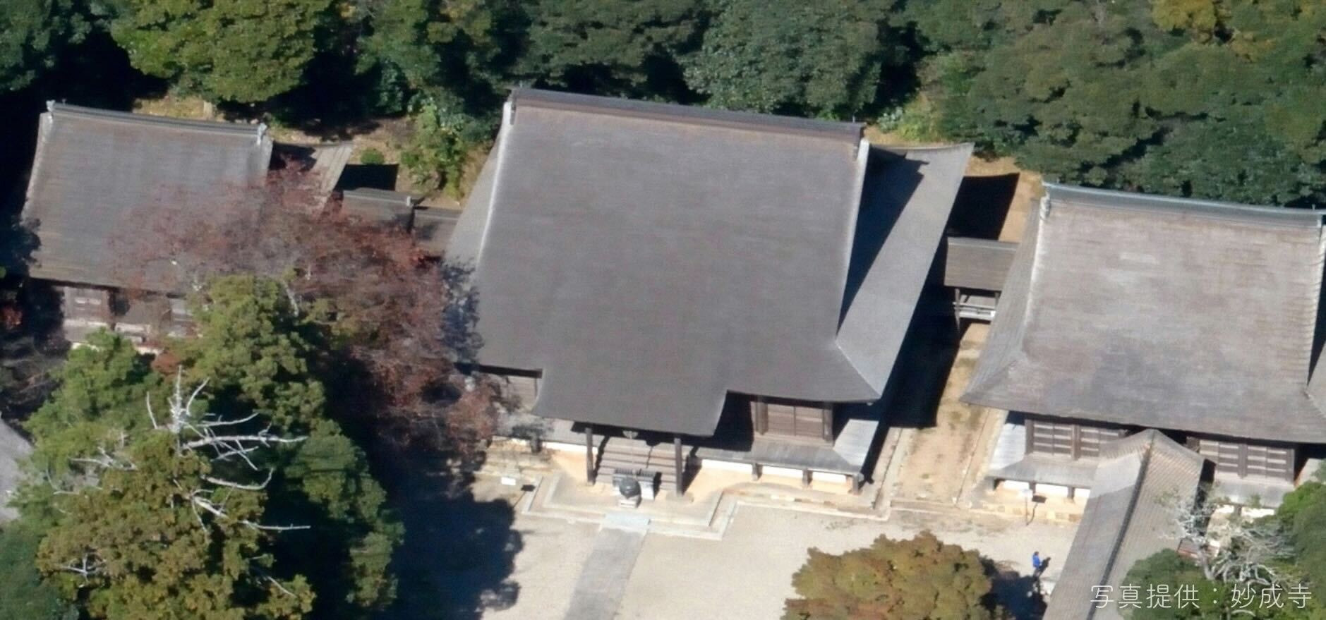 妙成寺の特徴は、本堂を真ん中に、向かって右に「祖師堂(そしどう)」、左に「三光堂(さんこうどう)」という3つの御堂が横一線に並んだ「3堂横並び」の配置。これは日蓮宗(法華宗)寺院の伝統的な寺院配置です。実は今でも建立当時の姿を残しているのは全国で妙成寺だけなのだとか。