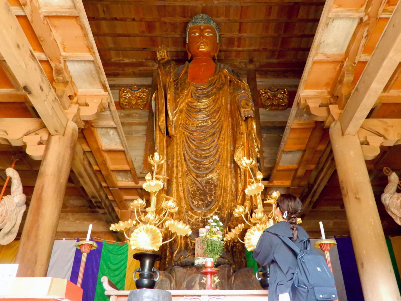 建物は外から見ると2階建てのように見えますが、中に入ってみると仏様の部分だけ2階の床が抜けているような造りでした。それでも天井に頭スレスレ…! だってその高さは約5メートルもあるんですもの。神々しいお姿に思わず手を合わさずにいられませんでした。合掌。