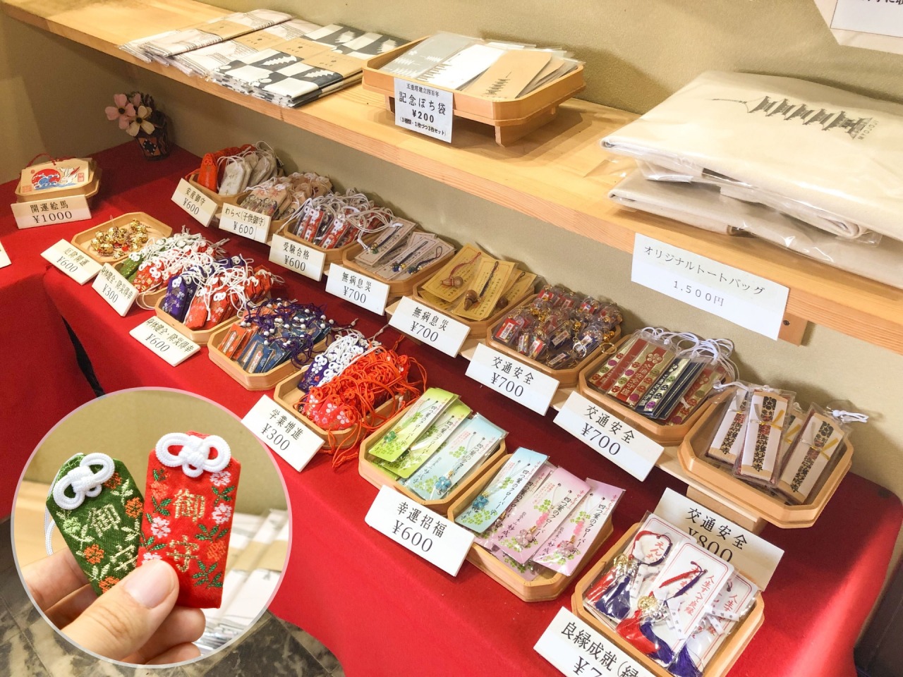 人気のお守りは「身体健全・除災得幸」守り。赤緑それぞれ300円、手に取りやすいお値段が嬉しいですね。五重塔がデザインされたトートバックや手ぬぐいもありましたよ。