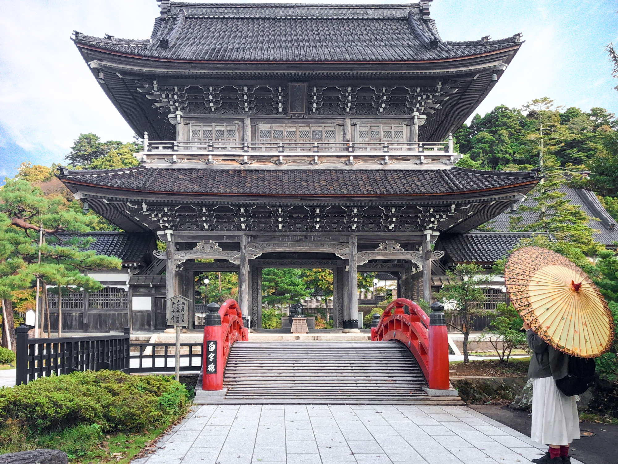 朱塗りの「白字橋」がアクセントになって、人気のフォトスポットになっています。ちなみに私が持っている和傘は、禅の里交流館(總持寺祖院から徒歩5分)で無料レンタルできますよ。