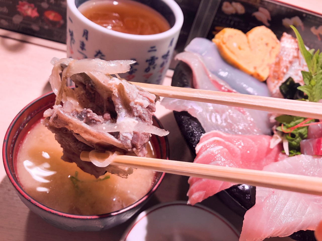 セットのお味噌汁は、魚介の出汁がたっぷり染み出たアラ汁。使うお魚はその日の仕入れ状況によって変わるようで、この日はフクラギの頭が入っていました。お味噌汁まで抜かりない美味しさに、お値段以上の満足感が得られますよ!