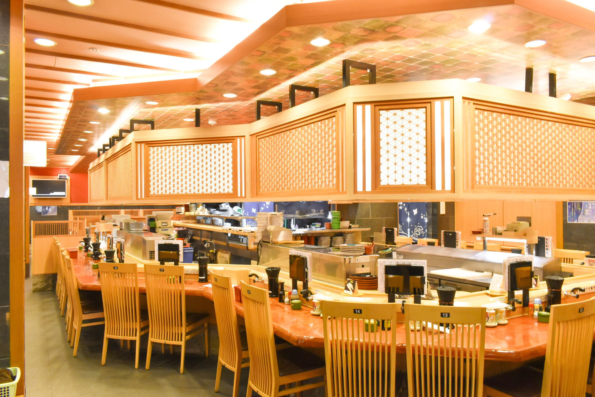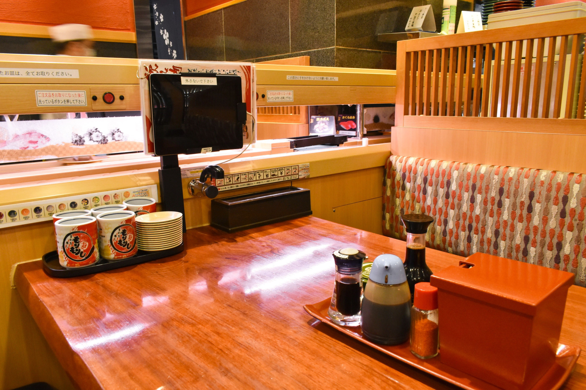 純和風の雰囲気が粋な店内は、ゆったりしたテーブル席と、職人さんの仕事が間近に見られるカウンター席が選べます。タッチパネルで注文したお寿司がレールで席に運ばれてくるので、握りたてのお寿司を味わえるのも嬉しいポイントです。