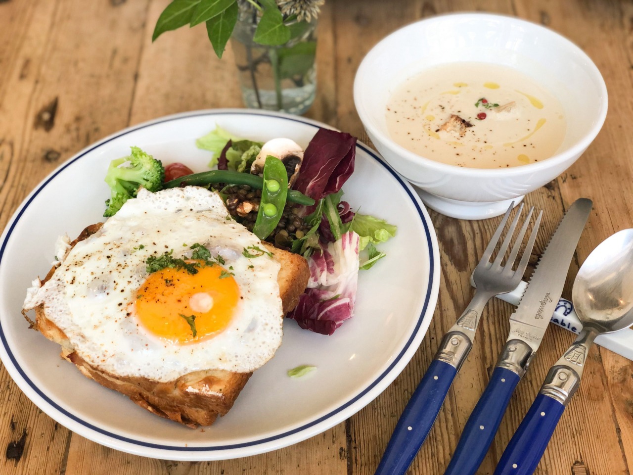 上に乗った目玉焼きにナイフを入れ、とろ~り出てきた黄身を絡めながらパクっとひとくち。カリッと焼きあがったトーストに、クリーミーなソースとチェダーチーズの濃厚な味わい。サンドされている自家製チキンハムも肉厚で食べ応え抜群◎