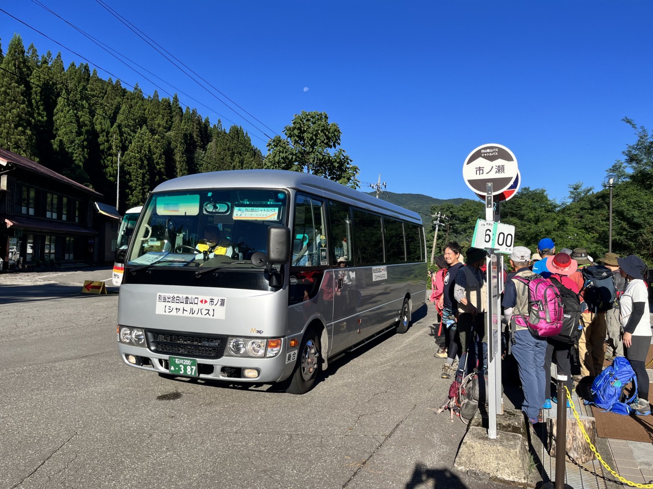 ここから登山道入り口のある別当出合(べっとうであい)までの約6kmの区間は、登山シーズン中(主に土日祝)は交通規制されているため、片道800円のシャトルバスに乗ります。