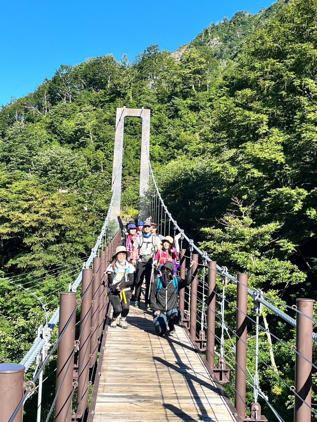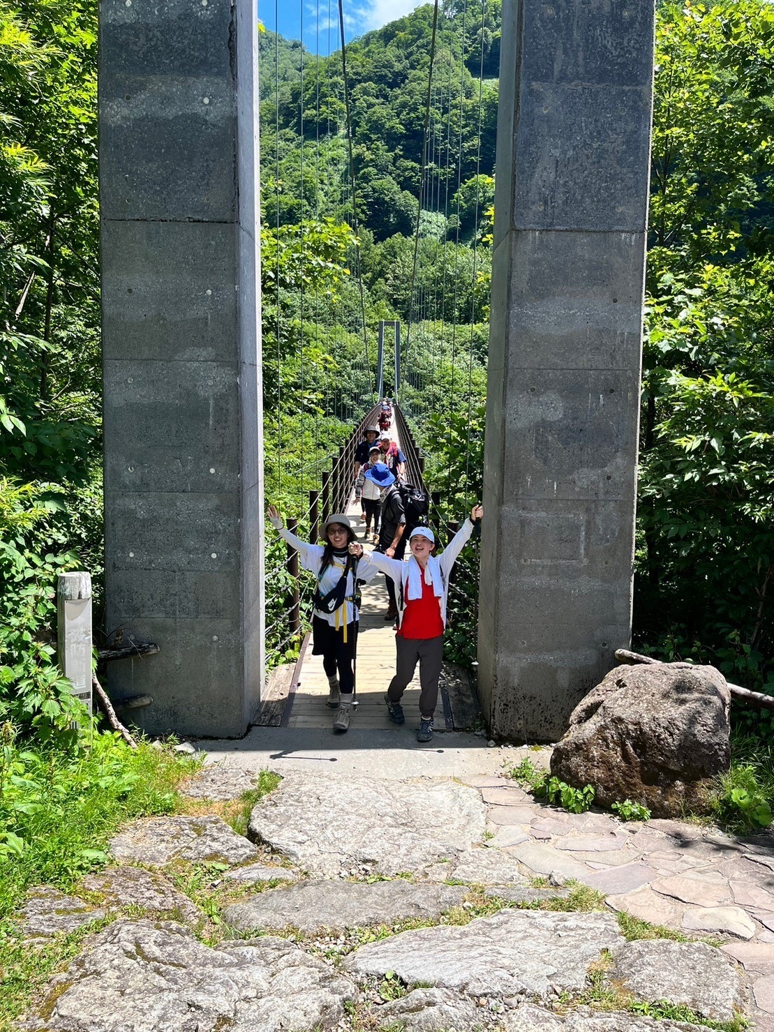 初めての白山にわくわくしながら、まずは大きな吊り橋を渡ります。