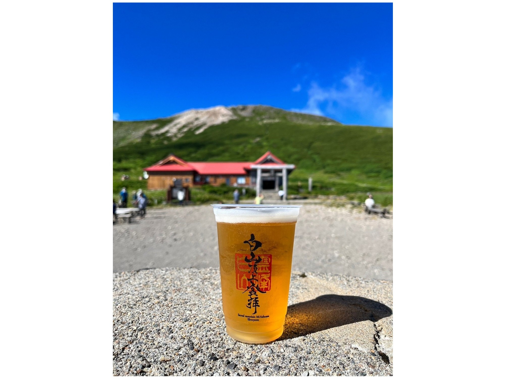 頂上を拝みながら生ビールで乾杯!達成感に溢れ、ビールが体にしみわたります…!