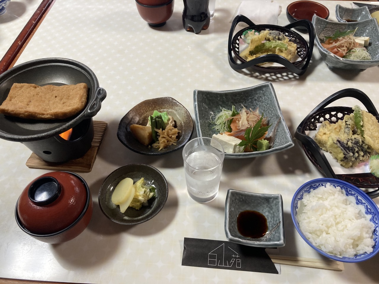白山の恵みをふんだんに用いた御膳で、白山の伏流水でつくられた堅豆腐の刺身や天ぷら、甘く味付けされた焼き油揚げ、ニジマスの刺身など、どれもとっても美味しかったです。