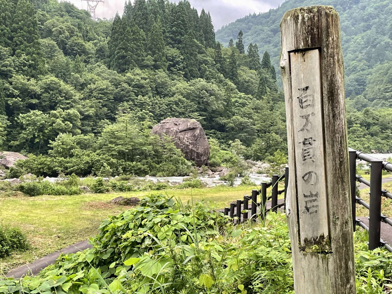 「百万貫の岩」は、県指定天然記念物で、地質100選に選ばれている、手取層群中の砂岩の巨大な転石です。昭和9年に発生した手取川大水害の際に、上流の宮谷川(みやたにがわ)より流出したと考えられています。