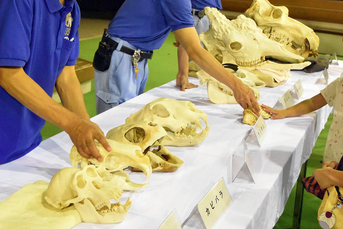 キリン、ライオン、チンパンジーなど様々な動物の頭蓋骨が展示されていて、本物の骨に触ることができます。獣医さんの特別解説もありますよ。集まっていた人たちは、大人も子どももみんな興味深そうに観察したり、獣医さんのお話に耳を傾けていました。