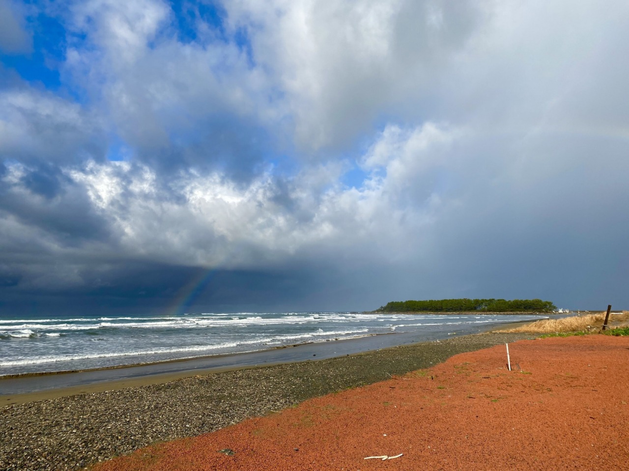 うっすらと海にかかる虹、見えますか?!とてもきれいな虹を見ることができ、朝から清々しい気持ちになりました。
