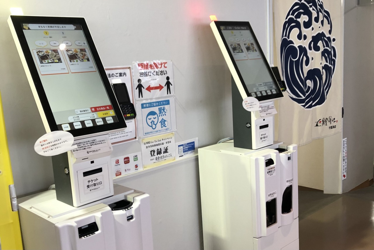 「浜焼き能登風土 千里浜店」の入口に、食券を購入する機械があります。
