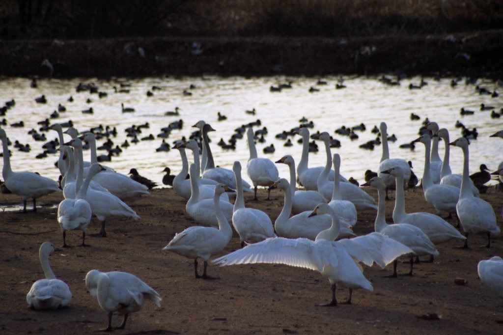 邑知潟周辺は、毎年10月下旬〜3月中旬ごろ白鳥が飛来することから「白鳥の里」と呼ばれています。観察の際は、白鳥を驚かさないように、静かな観察をお願いします。