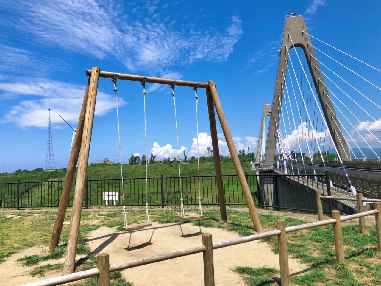 日本海やサンセットブリッジの景色を眺めながら揺られるこちらのブランコ。まるで空を飛んでいるような感覚は、こども達はもちろん大人も童心に返って楽しめます。フォトスポットにもなっているようで、ブランコに乗って記念撮影をしている方もたくさん見かけました。