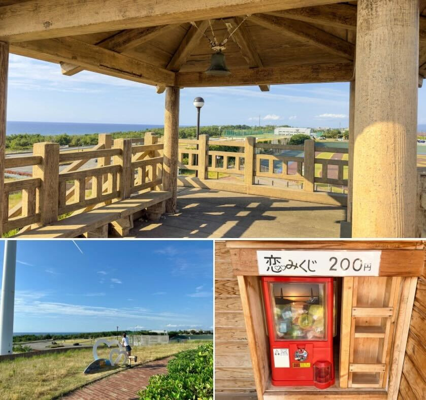 「恋みくじ」で二人の相性を占った後は、360度絶景の見晴らし台で「幸せへの鐘」を鳴らして愛の成就を願ってみましょう!心地よい潮風と美しい鐘の音色が響き渡り、最高のひとときを過ごせます!ダブルハートのオブジェもあるので、内灘海岸を背に記念撮影もできます。