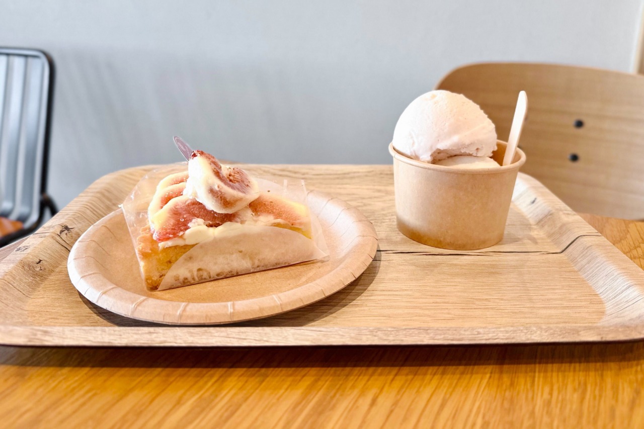 こちらで販売されている商品は、イートインコーナーでいただくこともできます。今回はイチジクのタルトと河北潟の搾りたて生乳を使ったジェラートをいただきました。
