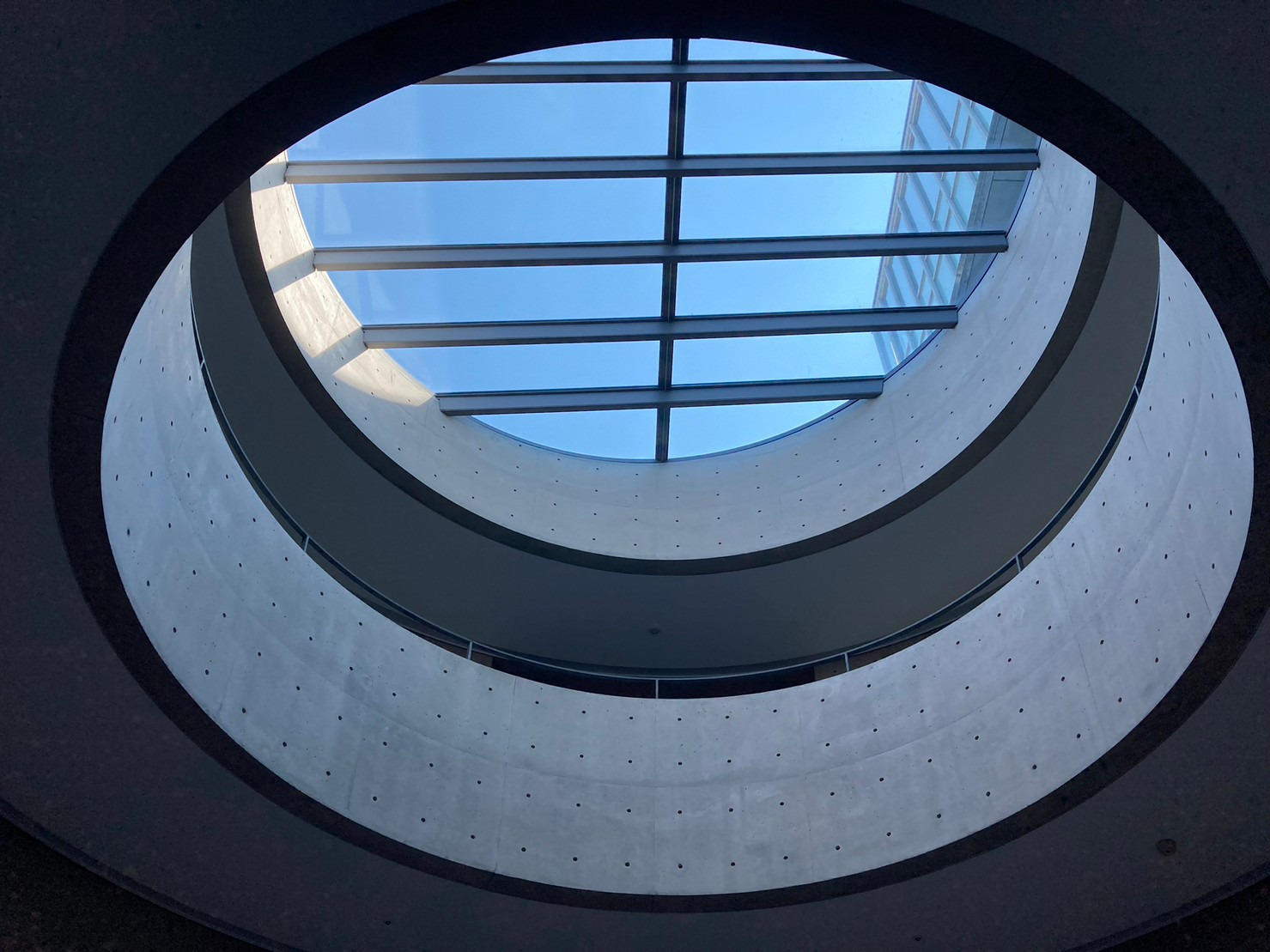 「ホワイエ」は研修棟地下1階にあるすり鉢状の円形空間で、天井の大きな丸い天窓から自然光が差し込み、空が見えます。