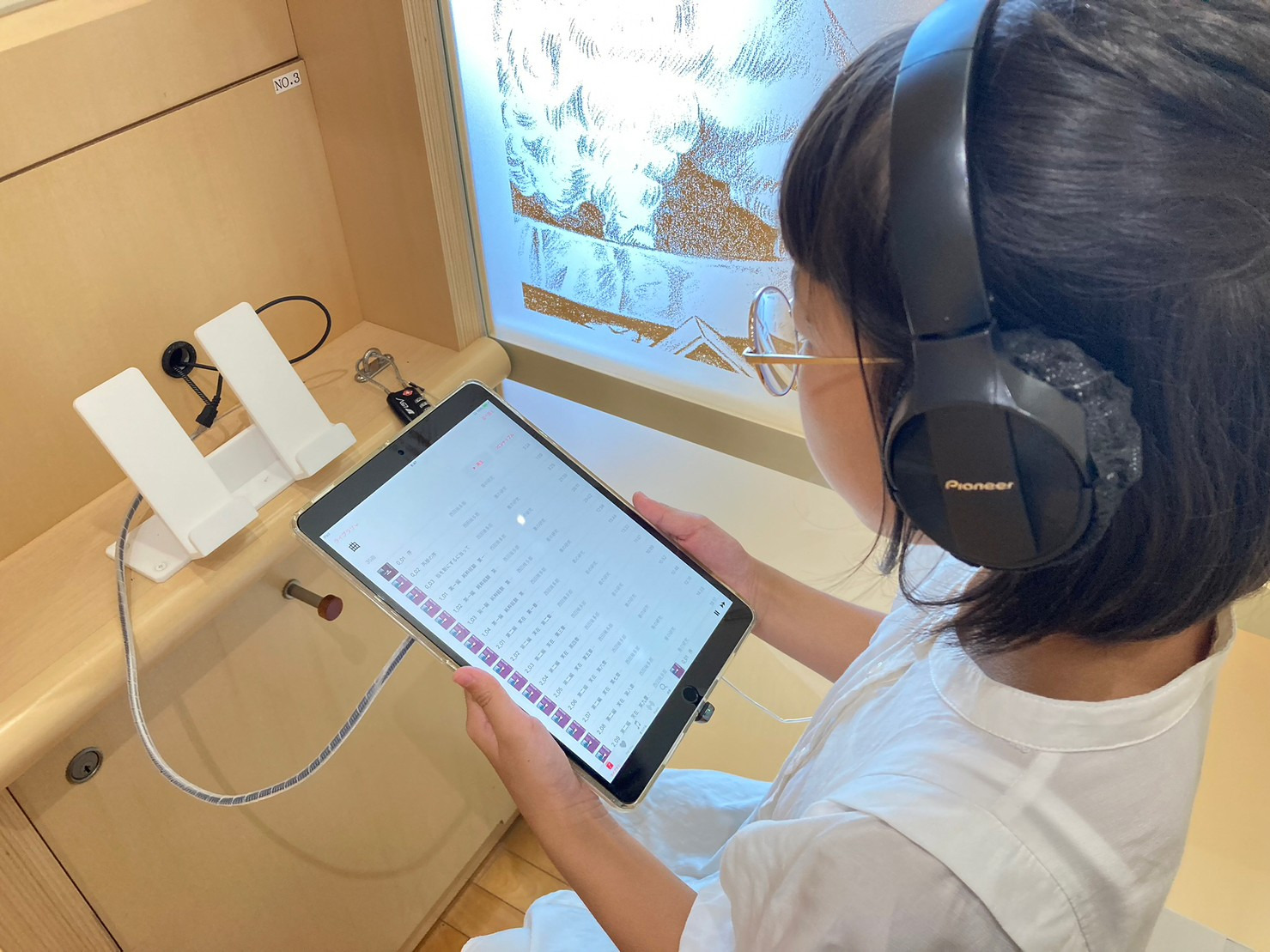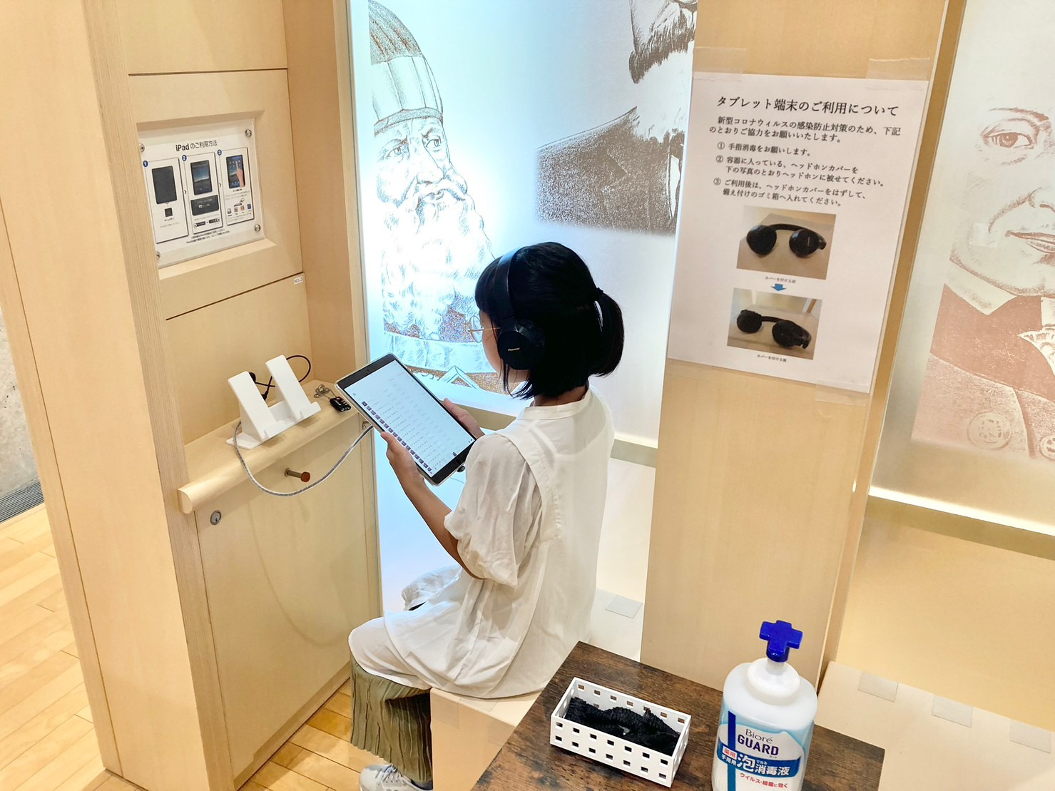 感染症対策として、消毒とヘッドフォン用の使い捨てカバーが置いてあり、タブレットを使って「善の研究」「哲学者に質問」などのページを見て学ぶことができました。
