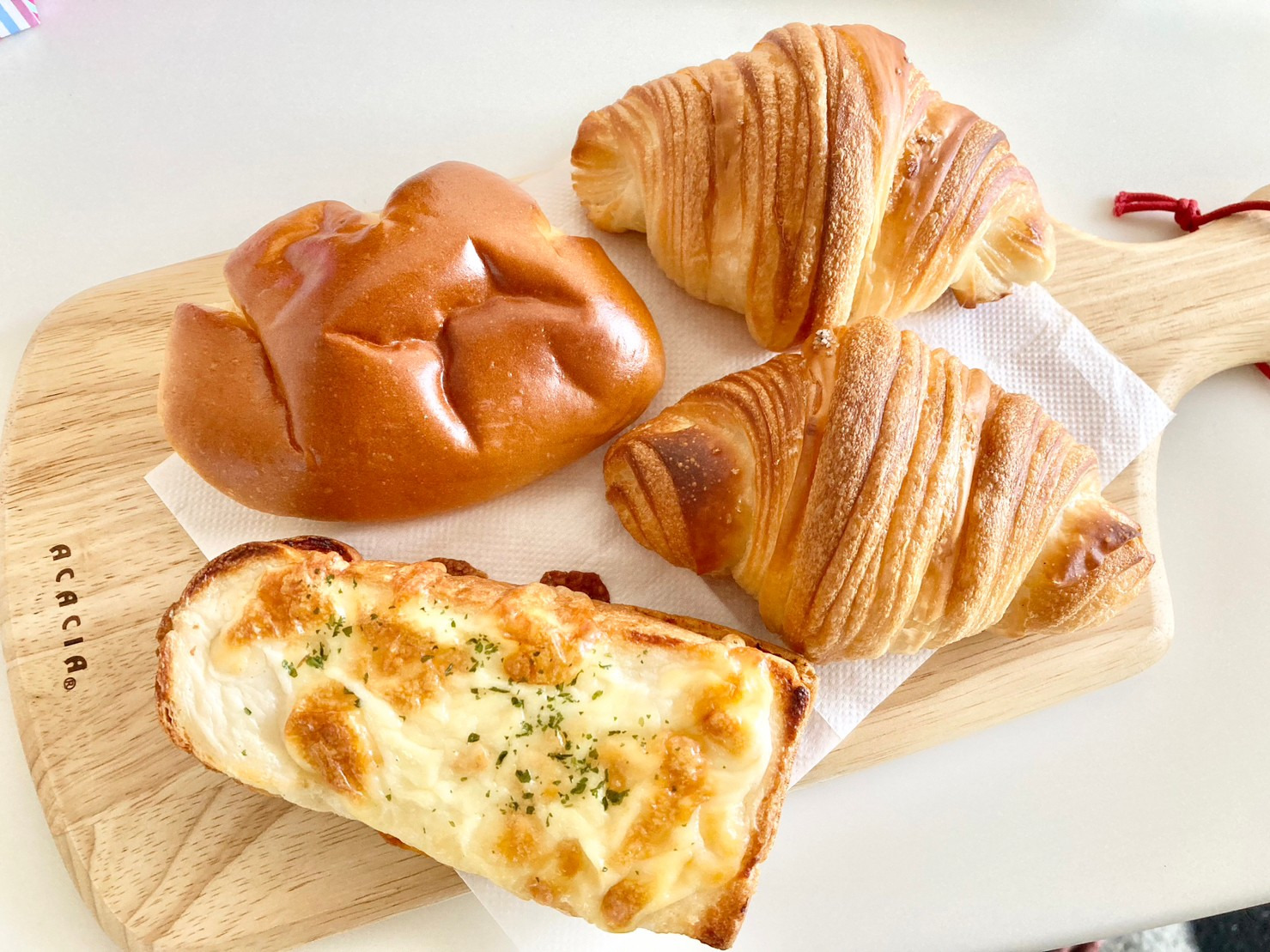 バターメロンパンやクロワッサン、甘栗のパン、朝のぜいたく食パンなど…種類豊富なパンが並びます。