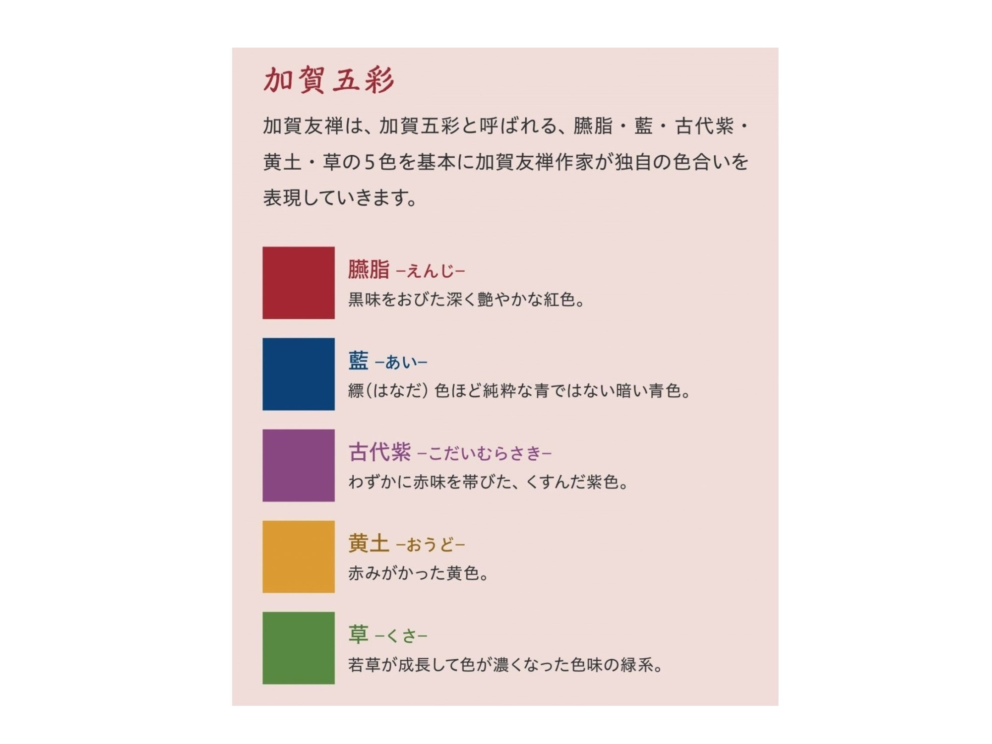 加賀五彩と言われる臙脂・藍・黄土・草・古代紫の5色を基調としており、美しい自然を表現しています。