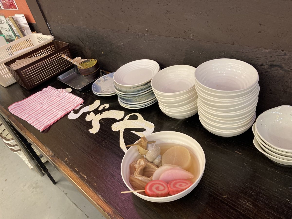 いっぷくやさんは、屋台風のフードコート「いっぷく横丁」さんの一角のおでん屋で、店内での食事のほかお持ち帰りもできます。