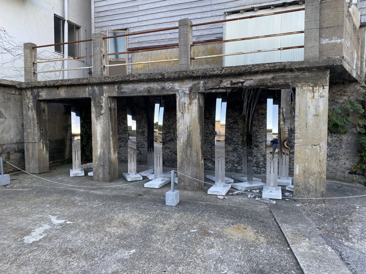 福浦港は、深く入り込む湾と急峻な崖に沿って建築物が集まっており、この特殊な地形に着目したのだそう。自然が作り出した造形に人工物が建てられ、それもまた地盤へと変化していくという、人の暮らしとそれを取り巻く地形との不可分な関係性を提起する作品です。