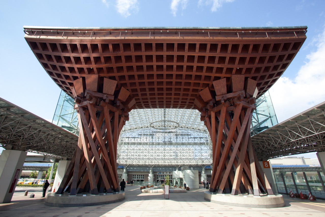 金沢のフォトジェニックなスポットとして人気なのが金沢駅の兼六園口にある鼓門です。金沢の伝統芸能の能楽で使用される鼓をイメージして2005年に造られた門で、隣接するもてなしドームとともにいまや定番の観光スポットとなっています。