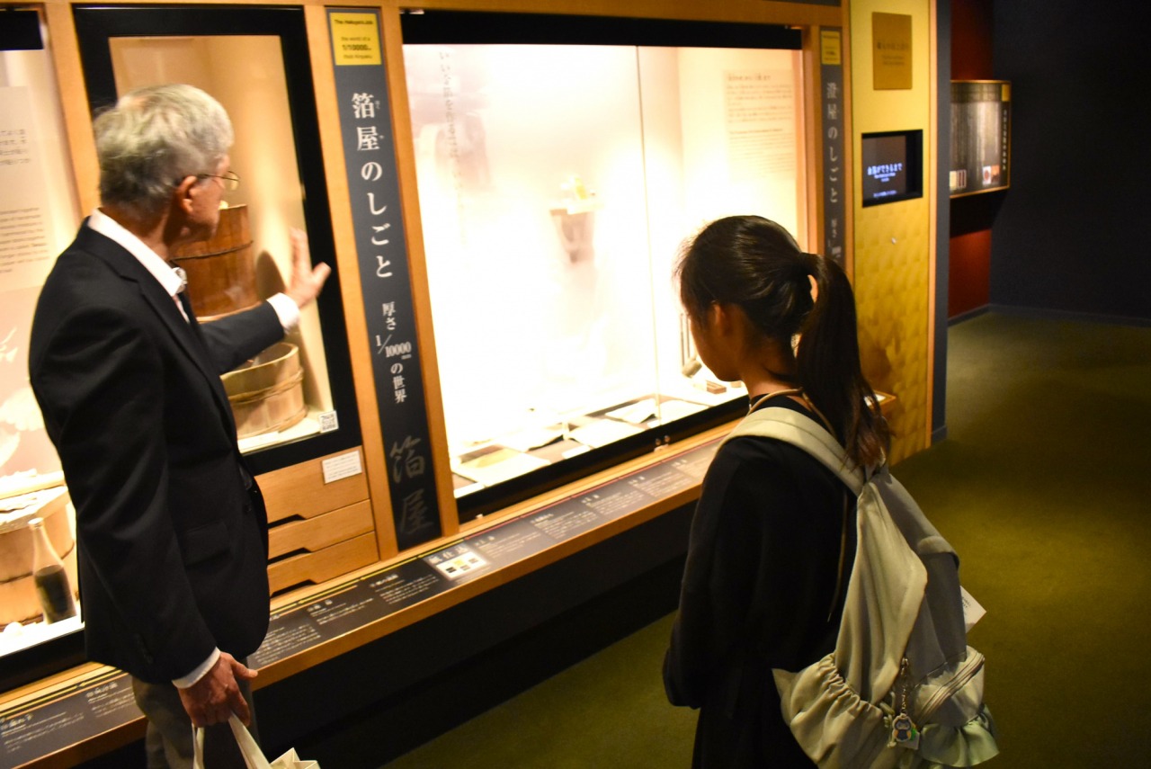 今回は特別に館長さんに金箔についていろいろと教えてもらいました。とくに印象的だったのは金箔づくりの工程「箔打ち」に使用する和紙のお話。この和紙を箔打紙に調整するために 1 年の半分ほどの月日を費やすほど大事な作業なのだそうです。箔打ちの役目が終わった箔打紙は、あぶらとり紙として使用されているのにもびっくりでした。