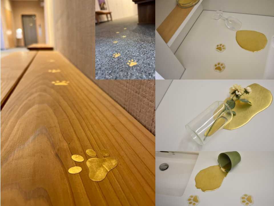 店内のいたるところにネコの足跡やしずくが金箔で表現されています。ちょっとしたストーリー仕立てになっているところもあるので、いろいろと探しまわるのも楽しいですよ。