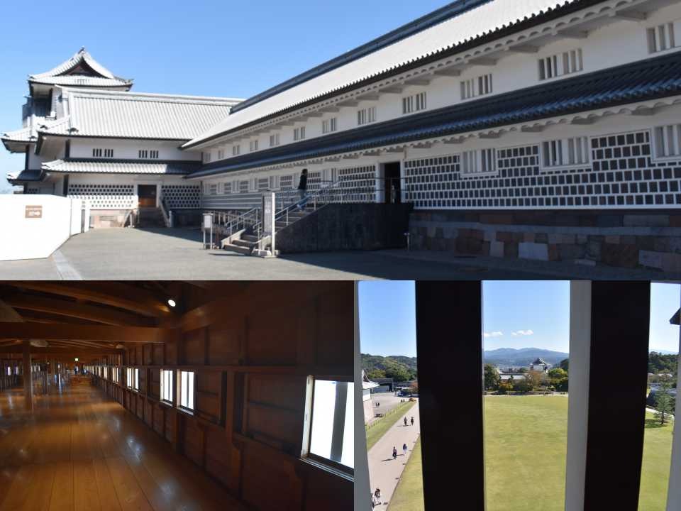 2001 年に復元された菱櫓、五十間長屋、橋爪門続櫓、橋爪門は、明治時代以降に建てられた国内最大規模の木造城郭建築物で、金沢城の歴史をはじめ、模型やどのような工法で造られたのかなどを知ることができます。歴史を感じながら眺める外の景色も素敵ですよ。