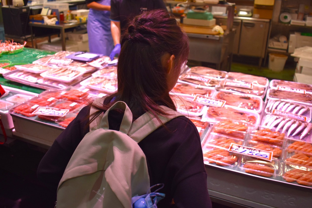 日本海の新鮮な魚介類が並んだお店がいろいろあるので、どこで何を買おうか迷っちゃいます。
