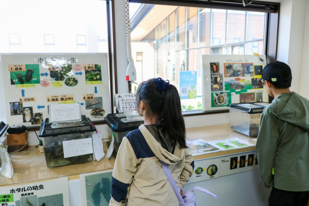 いきもの観察館には、ホタルやカブトムシ、蝶などが育てられていて、スタッフの方の説明を聞きながら観察できました。