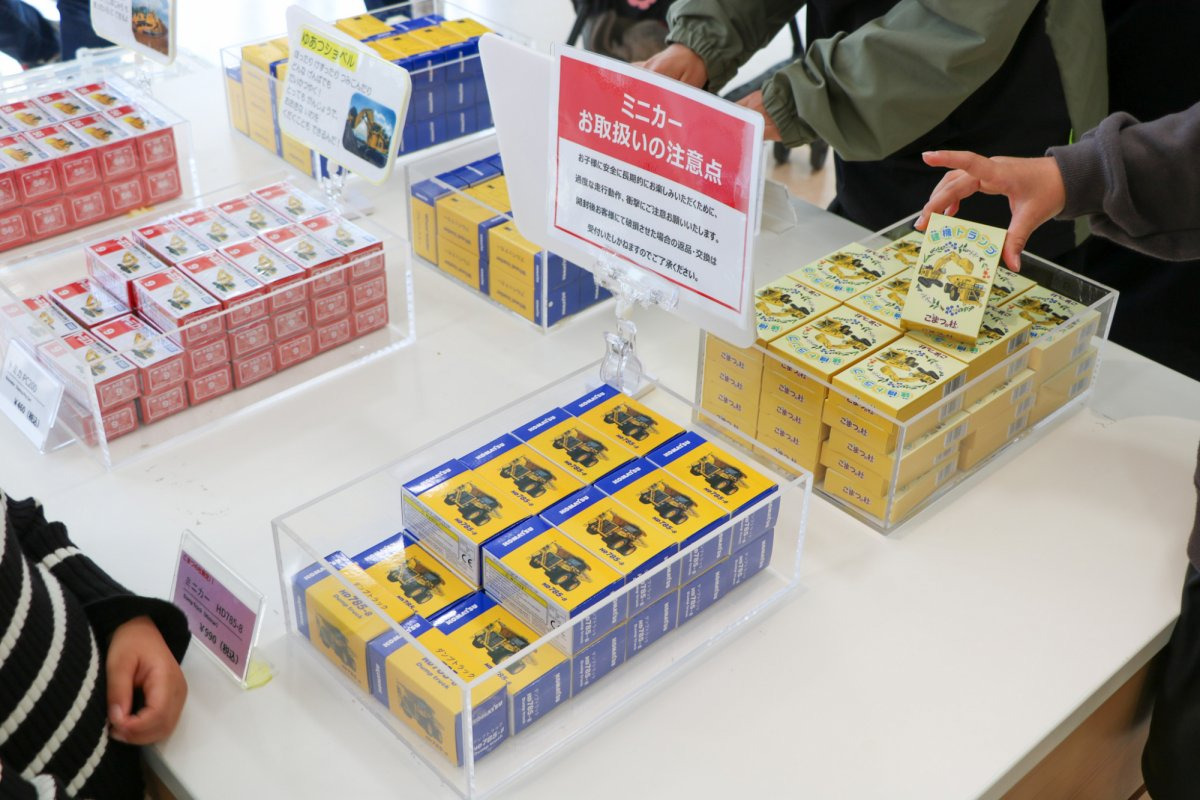わくわくコマツ未来館の中にある売店には、コマツやこまつの杜オリジナルグッズがたくさん並んでいました。