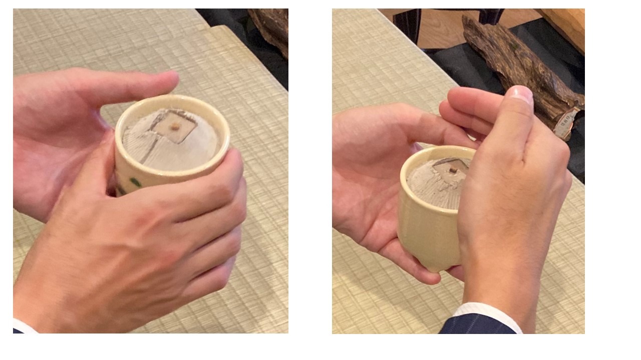 左手でお茶碗を持ち、右手を添え、左手に茶碗を乗せ、お茶碗を時計回りに2度回し、3回ほどに分けて飲みます。最後の一口は少し音を立て、一気に飲み切ります。