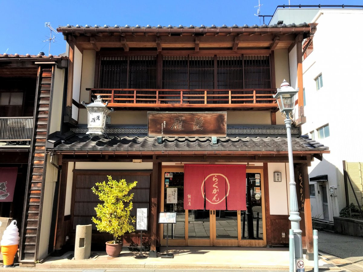 続いてはにし茶屋街に入ってすぐ右手にある『落雁 諸江屋 西茶屋菓寮』。諸江屋は、嘉永2年創業、その歴史はなんと約170年の老舗和菓子店です!お店の奥には茶寮『味和以(あじわい)』が併設されています。